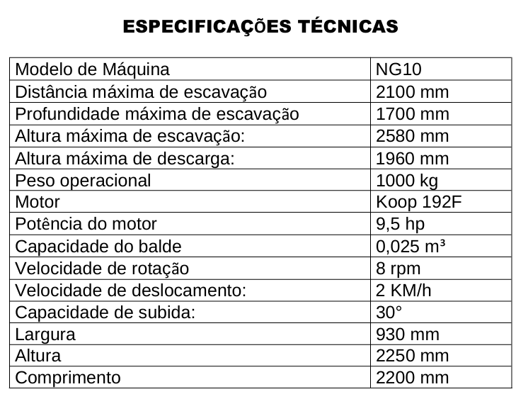 Mini Escavadeira - Modelo NG10 - 1.0 ton - Motor Diesel